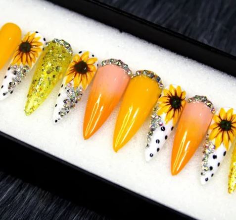 These beautiful sunflower inspired pretties are hand painted with lots of care and attention to detail. They’re made with high quality materials that have customers coming back for more. With proper prep of the nail by using a cuticle pusher and light buffing, you can get these fake nails to last up to two weeks or more.