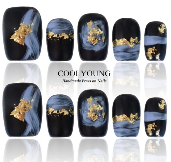 Coolyoung makes some fantastic press on nail sets like these short square nails with black and gold highlights.