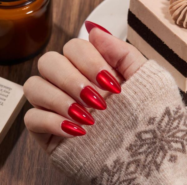 Red cat eye press on nails are one of my favorite winter looks because the deep color feels so warm and festive. They use a magnetic tool to bring out that cool shifting line in the polish. They’re easy to apply at home and really stand out when paired with cozy sweaters or holiday outfits.